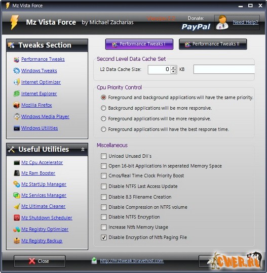 Mz Vista Force 2.1.2 - Утилита для настройки Windows Vista на оптимальную работу. При помощи Mz Vista Force можно повысить общую производительность системы, оптимизировать интернет-соединение, отредактировать автозагрузку, быстро добраться до панели управления службами, оптмизировать системный реестр, изменить некоторые из "скрытых" параметров системы, очистить историю и кеш браузера, настроить Windows Media Player и т.д. Для работы требуется .Net Framework 2.0.