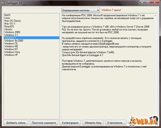 База данных с описаниями "пасхальных яиц" (скрытых возможностей в программах). Секреты таких известных продуктов, как Adobe illustrator, Acrobat reader, Acdsee, Corel Draw, Delphi, Dreamweaver, Fine reader, Firefox,Windows 7, Internet Explorer и многие другие.
