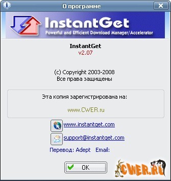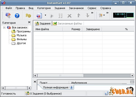 InstantGet - наверно самый простой в использовании менеджер закачек, но при этом имеющий все функции своих "старших собратьев". Поддерживается докачка файлов после разрыва связи, используется многопоточная загрузка файлов (прирост скачивания увеличивается до 5 раз), имеется встроенный поиск...
