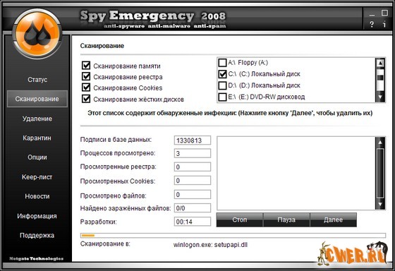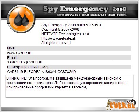 Программа Spy Emergency 2008 - быстро и безопасно удаляет spyware и другие интернет-инфекции c вашего компьютера. Spy Emergency защищает Вас против тысяч инфекций, включая: Spyware, Adware, Malware, ActiveX Components, Dialers, Keyloggers, Trojans... Интерфейс программы ненавязчив и прост, а функциональность и быстродействие просто поражают воображение!