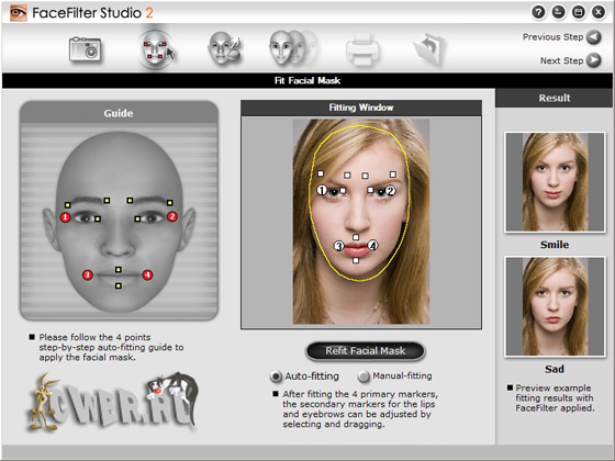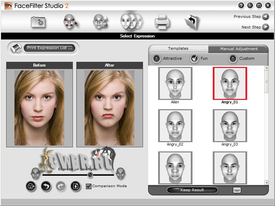 FaceFilter Studio - простой и быстрый редактор цифровых фотографий, специализирующийся на обработке портретов. Программа позволяет менять черты и мимику лица и является своего рода инструментом для виртуального макияжа и виртуальной косметической хирургии. Можно сделать из мрачного субъекта необыкновенно развесёлого человека, создать совершенно безупречное модельное лицо или просто подшутить над знакомыми, придав им облик Квазимодо, например. FaceFilter содержит огромную базу данных портретов, по которым выводит формулу привлекательного лица. Программа сделает так, что на фотографии человек выглядит моложе, умнее, добрее и т.д. Также позволяет пользователям корректировать изображения, в частности, неправильное освещение, эффект красных глаз, неверное соотношение цветов на фото или неудачно пойманное выражение лица.