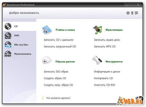 - запись с любых типов носителей CD/DVD, а также Blu-Ray (BD-R/BD-RE)