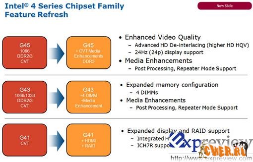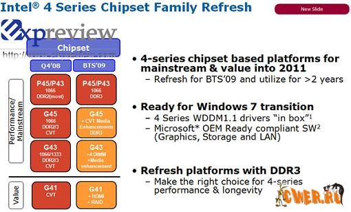 Чтобы не снижать конкурентоспособность своей продукции, а также обеспечить ей соответствие современным требованиям, компания Intel намерена внести некоторые качественные усовершенствования в наборы системной логики 4 Series. В преддверии выхода операционной системы Windows 7 материнские платы на базе Intel 4 Series получат поддержку новой модели графического драйвера WDDM 1.1 (Windows Display Driver Model), а OEM-производителям будут предоставлены новые драйверы для сетевых адаптеров и других комплектующих.