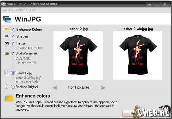 WinJPG - небольшая программа для оптимизации цифровых фотографий, буквально одним кликом мыши. Пользователю предлагается выбрать один или несколько типов оптимизации и программа в дальнейшем будет действовать по указанному алгоритму. Программа позволяет увеличить резкость, контраст, яркость, скорректировать цветовую гамму, добавить водяной знак, изменить размер фотографии и прочее. Установив опцию сохранения исходной копии, пользователю будет гарантировано сохранение оригинала, в случае, если корректировка его не устроит. Также программой поддерживается пакетная обработка фотографий в одной или даже нескольких папках. Имеется поддержка PNG, GIF, JPEG, BMP, ICO, EMF, WMF, TIF и других графических форматов.