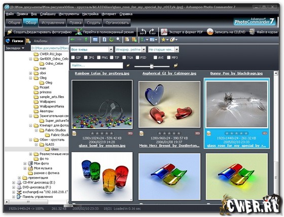 Ashampoo Photo Commander - новая седьмая версия программы, представляющая собой универсальный набор средств для работы с цифровыми изображениями. Позволяет с комфортом просматривать цифровые фотографии, в удобном виде организовывать их хранение и сортировку на жёстком диске компьютера, также присутствует возможность создания слайд-шоу и запись его на CD/DVD диски. Встроенный графический редактор позволяет регулировать яркость и контрастность всего изображения или отдельного фрагмента, вращать изображение, зеркально отображать его, выводить на печать и отправлять цифровые фотографии по электронной почте. Поддерживается работа с RAW файлами и имеется возможность быть использованной в качестве медиапроигрывателя. В седьмой версии программы появилось несколько новшеств, включая аппаратное ускорение 3D, возможность создания панорам, новые расширенные функции поиска и множество других улучшений. Программа обладает приятным и удобным пользовательским интерфейсом, теперь с многоязычной поддержкой, включая русский язык.