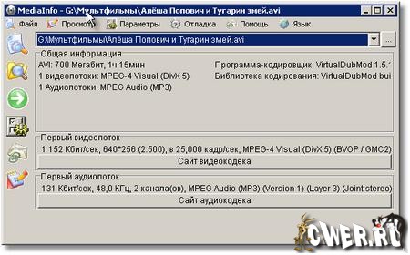 MediaInfo - программа, которая предоставляет подробную информацию об аудио и видео файлах. MediaInfo показывает, каким кодеком сжато видео, с каким битрейтом, какое в нем соотношение сторон и количество кадров в секунду. Для аудиофайла MediaInfo показывает используемый кодек, битрейт, язык, количество каналов, частоту выборки и т.д. Показав сведения о файле, программа тут же посоветует, где можно скачать недостающий кодек или проигрыватель.