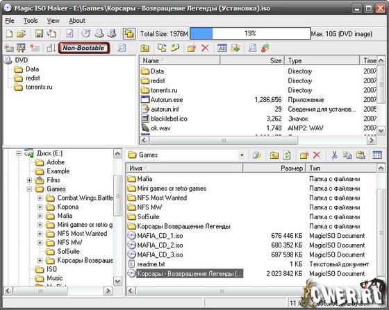 Magic ISO Maker - мощный инструмент для создания и редактирования образов CD/DVD дисков. С помощью MagicISO вы можете создавать и редактировать образы дисков, извлекать отдельные файлы из образов, записывать файлы образов на CD/DVD, создавать загрузочные диски. Одним из достоинств программы является большой список поддерживаемых форматов – она работает с ISO, BIN, NRG, CRF, BWI, IMG и др. Так же может конвертировать BIN или любой другой формат, созданный с помощью софта записи или виртуального CD в стандартный ISO. Имеет возможность создания и самих ISO файлов. Вы можете добавить, удалить или переименовать файлы и папки в файле образа. Может оперировать с 10 гбайтными объемами, так что пользователь может с легкостью извлекать, редактировать и открывать DVD образы. В последних версиях программы добавлена возможность открытия, извлечения и редактирования образа диска FAT32, а также произведена оптимизация для Windows Vista.