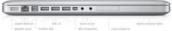 • Порт MagSafe Power Port, разъём RJ-45, порт FireWire 800, три порта USB 2.0, порт Mini DisplayPort, слоты ExpressCard/34 Slot и Kensington Lock Slot, гнёзда для подключения наушников и внешнего микрофона;