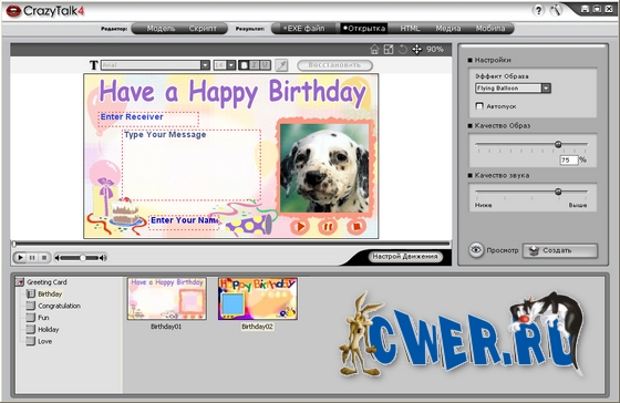 - CrazyTalk может преобразовать текст в речь. Текст, который вы набираете, произносится картинкой расположенной сбоку. После ввода текста можно создать видео файл, для последующей посылки его своим друзьям или загрузить на мобильник.
