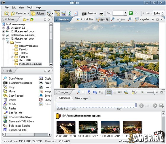 ExifPro - приложение, предназначенное для отображения, обработки и просмотра фотографий. Программа позволяет отображать изображения в нескольких режимах. Выделенные изображения вы сможете копировать, изменять в размерах, обрезать и всячески настраивать, используя инструменты, встроенные в программу. Также данная программа позволяет отображать EXIF информацию, встроенную в фотографии, описывающей различные параметры фотокамеры, которая была использована во время снимка. С помощью программы можно создавать HTML альбомы, слайд-шоу, с использованием встроенных в программу генераторов, печатать изображения, добавлять описания и теги к изображениям. Отдельное окно просмотрщика предлагает пользователю инструменты для масштабирования и панорамирования, коррекции цвета и вида изображений, инструмент лупы и режим слайд-шоу.