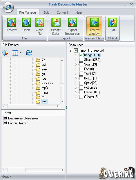 Flash Decompile Master это программа для извлечения ресурсов из SWF файлов (роликов Flash). Все составляющие (звуки,графику, видео, формы, фреймы, эффекты, шрифты, тексты, кнопки и спрайты) можно легко извлечь на жесткий диск.