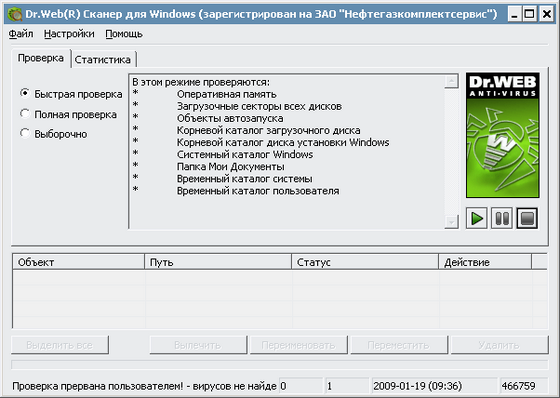 • Dr.Web Сканер – антивирусный сканер с графическим интерфейсом. Программа запускается по запросу пользователя или по расписанию и производит антивирусную проверку компьютера. Существует также версия программы с интерфейсом командной строки (Dr.Web Консольный сканер для Windows).