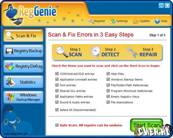 Кроме того, RegGenie предлагает широкий спектр дополнительных функций, включая автоматическое сканирование и ремонт графика, дефрагментацию реестра, простое резервное копирование и восстановление процесса, и простой способ управлять Вашей ОС.