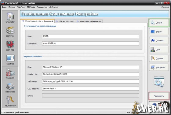 Набор дополнительных настроек и возможностей, влияющих на безопасность, производительность и удобство использования операционной системы и не входящих в стандартную поставку MS Windows. Настройки подразделены на шесть групп, каждые из которых разбиты на подгруппы в целях упрощения навигации: