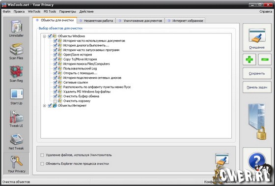WinTools.net Ultimate – набор инструментов для оптимизации операционной системы Windows. В состав программы входят компоненты для полного удаления нежелательных программ и «мертвых» ссылок реестра, а также для контролирования процессов, настройки системы, интернет-соединений и интерфейса. В состав программы входят следующие инструменты: Clean Uninstaller, Scan Files, Scan Shortcuts, Scan Registry, Startup Manager, Tweak UI, Net Tweaker, The Privacy, Invisible Man, File Shredder. Кроме того, имеются утилиты для надежного хранения конфиденциальной информации. Работает на платформах Windows 2000, 2003, XP и Vista.