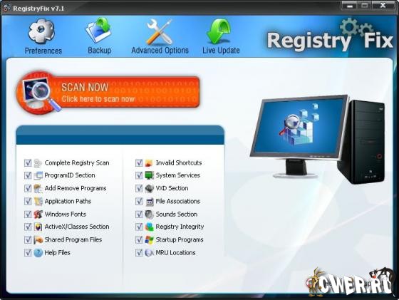 RegistryFix выявляет и устраняет ошибки в системном реестре Windows, причем делает это очень хорошо, и без необходимости перезагрузки компьютера для того, чтобы изменения вступили в силу. Список областей очистки реестра довольно широк: - программная область, - установка/удаление программ, - установленные шрифты, - совместно используемые файлы, - файлы помощи, - область автозагрузки программ, - системные сервисы и драйвера - ярлыки и т.д. Перед началом процесса чистки можно сделать резервную копию реестра.