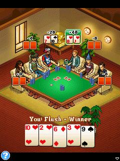 Игра для мобильных телефонов. Добро пожаловать в уютное кафе, чтобы сыграть с друзьями партию в покер. Размеры экранов: 176x208, 240x320, 320х240, 352x416.