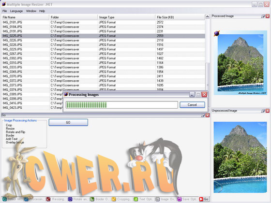 Multiple Image Resizer .NET - удобный инструмент обработки изображений. В пакетном режиме изменит размер, обрежет, добавит границы, текст, а также повернет рисунок так, как вам нужно. Одновременно для каждого рисунка доступно превью. Обработанные файлы сохраняются в новую папку, могут быть сразу же переименованы. Программа работает с файлами BMP, JPG, GIF, TIFF, EXIF, PNG, EMF, ICO, WMF и может конвертировать один формат в другой.