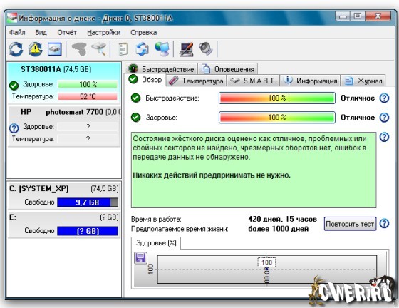 - работает с накопителями через интерфейсы IDE, Serial ATA и SCSI, определяет статус и температуру в реальном режиме; показания отображаются мгновенно, нет необходимости проводить длительную диагностику; отображает текущую и минимальную температуру накопителей, специфические атрибуты в зависимости от производителя; продвинутым пользователям пригодятся значения часов наработки и количество ошибок чтения/записи; интерпретирует значения производительности и состояния S.M.A.R.T. в процентный показатель для более простого понимания;