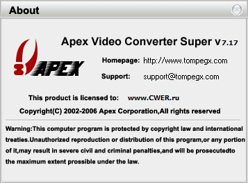 Extremely fast conversion speed and friendly user interface let you convert video files between many formats with ease. The powerful features and unbeatable price make Apex Video Converter Super an affordable and powerful video conversion solution on personal computer. let's meet on cwer.ws Apex Video Converter Super supports batch files conversion, specifies start and end position while convert, supports large video files, even large then 2GB. No Technical Knowledge Required. Also you can select to automatically shut down your PC after conversion.