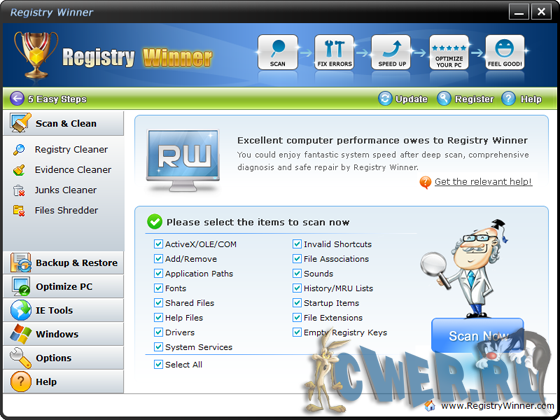 Registry Winner – программа для улучшения работы компьютера, которая находит ошибки, оптимизирует систему и ускоряет ее. Вы можете столкнуться с различными проблемами, которые постепенно появляются с использованием компьютера, например, замедление, зависание, «голубой экран смерти», постоянные сообщения об ошибках и т.д. Registry Winner использует только самые продвинутые технологии для сканирования ваших жестких дисков и дает вам наиболее полную диагностику всего за несколько секунд. Как только проблемы обнаружены приложением, Registry Winner предложит вам профессиональное и высокоэффективное решение для вашего компьютера.