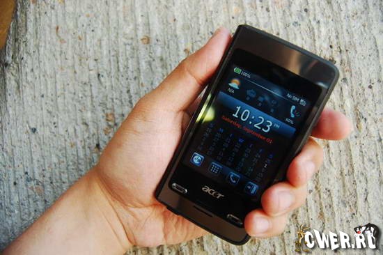 Особенностью Acer DX650 является двусторонность – два дисплея, две функциональные стороны. На основной части размещен большой тачскрин, а на вторичной – небольшой черно-белый экран и цифровая клавиатура. По замыслу производителя, пользователь будет использовать большой экран для работы с мультимедиа, а клавиатуру и маленький дисплей – для звонков и отправки SMS.