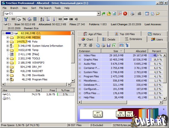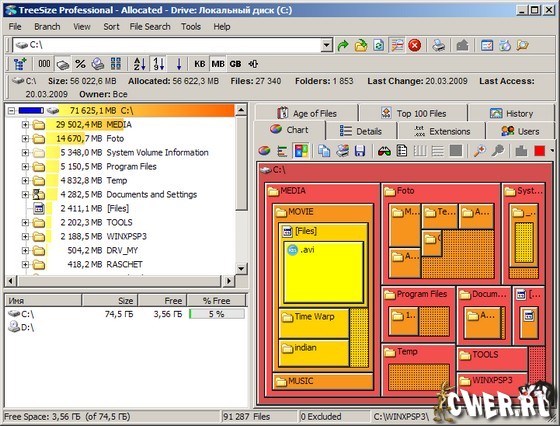 TreeSize Professional показывает дерево находящихся на жестком диске директорий вместе с их размерами, позволяя, при необходимости, распечатать результат. Интегрируется в Проводник Windows, добавляя новую колонку. Программа выдает информацию о количестве файлов в папке, дате последнего доступа, владельце файла и многое другое. Кроме этого, выводит данные в наглядном графическом виде (диаграмма), имеет встроенную систему поиска и экспорт / импорт результатов в XML-файл. Также позволяет вам искать старые, большие, временные и пустые файлы. Поддерживает режим командной строки - это удобно для планирования и ночных запусков. Предусмотрено создание плановой задачи проверки, настройка ее для проверки по некоторому пути и формирование набора отчетов в соответствии со стандартным расписанием.