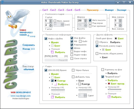 Video Thumbnails Maker - это программа, которая позволяет снимать "превью" с видеофайлов. Утилита имеет широкий диапазон настроек. Поддерживается пакетное снятие превьюшек, раскадровка, водяные знаки, обрезка углов кадров, рамки, тени, альфа-каналы, штамповка времени в кадрах, добавление информации о видео, настраиваемые прозрачность, цвета и шрифты. Поддерживаемые форматы видео? Любые, для которых есть подходящие кодеки (читайте, любые, которые воспроизводятся в BSPlayer-e, Windows Media Player-e, ...). Для работы программы необходим Microsoft .NET 2.0.