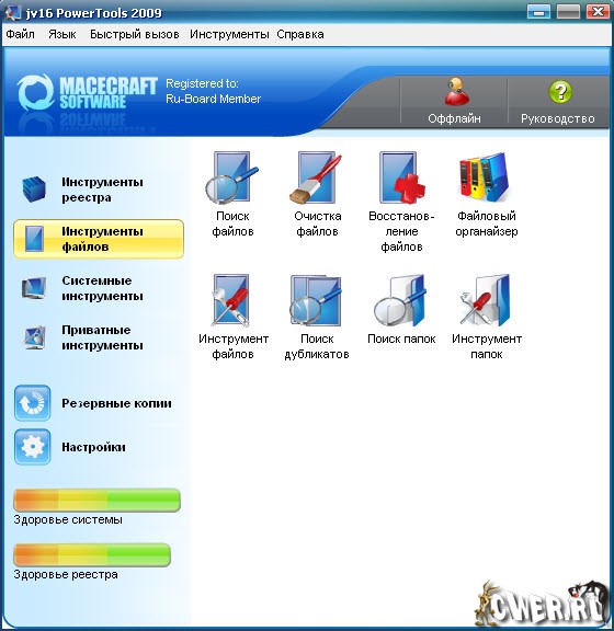 jv16 PowerTools - одна из лучших программ для работы с системным реестром. Включает в себя инструменты для работы с реестром: мощный менеджер реестра - позволяет работать со списком программ из автозагрузки и деинсталляции, со списком зарегистрированных в системе типов файлов, расширений, контекстным меню IE (с тем, в которое часто вставляют свои пункты менеджеры закачек) и некоторыми другими. Этот менеджер часто помогает вручную удалить остатки после автоматической очистки реестра программы. Возможно использование в локальной сети.