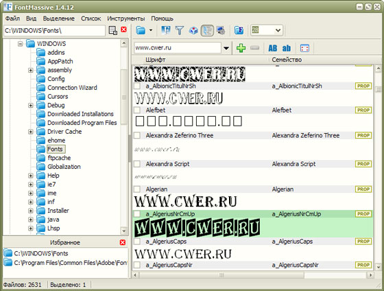 - Просмотр шрифтов без установки с любого источника (папки, CD/DVD-ROM, сетевое окружение).