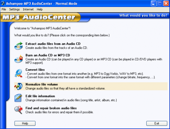 Ashampoo MP3 AudioCenter - менеджер извлечения, создания CD, конвертации, редактирования и восстановления звуковых файлов! Программа автоматически кодирует и декодирует аудио и позволяет пользователю в ручную указать программе на что нужно особенно обратить внимание.