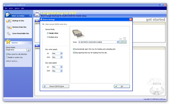 LargeBackup to DVD – программа, которая записывает большие файлы CD/DVD-диски, при этом используя один быстрый пакетный режим. Вне зависимости от формата файла, данное приложение запишет многочисленные гигабайтные документы напрямую на носитель при помощи технологии, которая позволяет разделять файлы на лету. LargeBackup to DVD достаточно сноровист, поэтому может склеивать файлы в один момент обратно. Не нужно больше тратить время и нервы, искать побочный софт для всех процессов – решение у вас под рукой. LargeBackup to DVD может также синхронизировать приводы, таким образом создав мини-автозагрузчик. Программа поддерживает различные виды резервного копирования данных с жесткого диска на CD или DVD, но основная специализация, конечно, мультимедиа-файлы (изображения, аудио и видео) большого формата, базы данных, или файлы, созданные другими приложениями для бекапа.