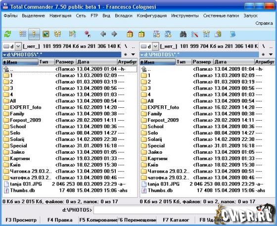Total Commander - популярный файловый менеджер с практически всеми необходимыми для таких программ функциями. Кроме всех функциональностей, характерных для файловых менеджеров, в Total Commander встроены очень удобные просмотрщики для мультимедиа и графических файлов, распаковщики ZIP, ARJ, LZH, RAR, UC2, TAR, GZ, CAB, ACE и дополнительные dll для других архивных файлов; встроенный ftp-клиент - вообще просто прелесть: можно скачивать/закачивать файлы в несколько потоков, есть докачка, поддержка www-прокси при работе с ftp и есть даже такая функция, как подключение-скачивание-отключение в заданное время к заданному ftp.