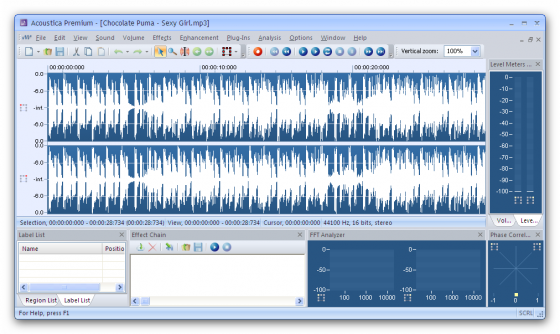 Acon Digital Media Acoustica Premium - полнофункциональный звуковой редактор с поддержкой многоканальных звуковых форматов 5.1 и 7.1. Дополнительная опция прожига компакт-дисков в данной программе обеспечивает точный контроль над деталями при производстве звуковых компакт-дисков (длины пауз, индексные маркеры, поля CD-TEXT и т.д.). В программе имеются инструменты для динамической обработки, выравнивания, а также множество различных эффектов, таких как реверберация, хорус и другие. Позволяет восстанавливать записи, искаженные шумом, щелчками, потрескиванием или отсутствием высоких частот. Поддержка плагинов DirectX и VST дает возможность использовать инструменты и эффекты сторонних производителей. Отличие премиум-версии от стандартной заключается в поддержке мультиканальных форматов 5.1 и 7.1, также имеется встроенная функция прожига CD.