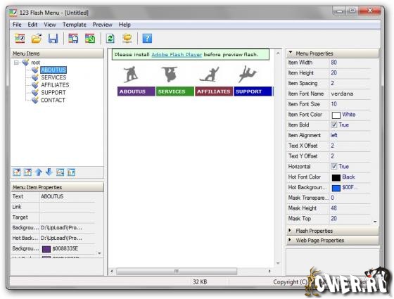 123 Flash Menu - мощный инструмент для создания внушительного и профессионального меню за 3 шага. Сотни предсозданных шаблонов помогают Вам осуществлять персонифицированное меню. Это дает вам динамические эффекты подобно анимации, звукам, градиенту и прозрачности без навыков программирования. Программа предлагает многоуровневое меню Flash с полностью настраиваемым текстом, шрифтом, связью, фоном, стилем границы, теневым стилем и прочими эффектами. Содержит в себе более 100 готовых шаблонов.