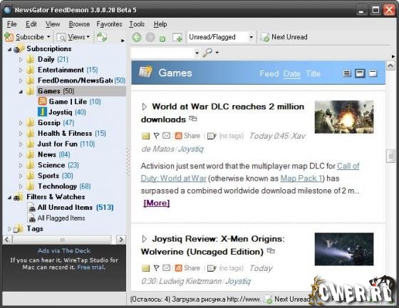 Вышла новая версия FeedDemon - одна из самых популярных программ для получения новостей с сайтов по технологии RSS и XML. По сравнению с обычным просмотром сайтов с помощью браузера, технология RSS имеет два существенных плюса - возможность практически полной автоматизации и значительное уменьшение обьема скачиваемых данных за счет отсутствия в получаемых новостях рекламы (нет ни баннеров, ни чего-либо еще).
