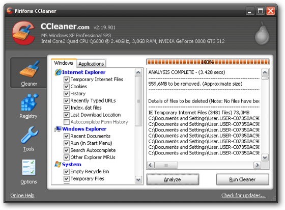 Кроме чистки Windows, CCleaner также умеет проводить удаление временных и др. ненужных файлов многих других программ, включая: Firefox, Opera, Media Player, eMule, Kazaa, Google Toolbar, Netscape, Office XP, Nero, Adobe Acrobat, WinRAR, WinAce, WinZip и др...