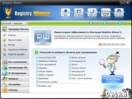 Registry Winner – программа для улучшения работы компьютера, которая находит ошибки, оптимизирует систему и ускоряет ее. Вы можете столкнуться с различными проблемами, которые постепенно появляются с использованием компьютера, например, замедление, зависание, «голубой экран смерти», постоянные сообщения об ошибках и т.д. Registry Winner использует только самые продвинутые технологии для сканирования ваших жестких дисков и дает вам наиболее полную диагностику всего за несколько секунд. Как только проблемы обнаружены приложением, Registry Winner предложит вам профессиональное и высокоэффективное решение для вашего компьютера.