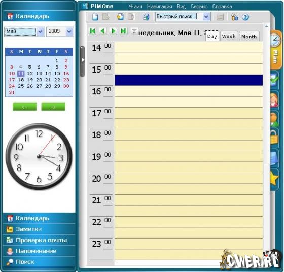 Разработчики этого элегантного персонального органайзера не стали "грузить" пользователя непонятным интерфейсом, а просто полностью повторили его бумажный аналог, что оказалось крайне удобным и не требует от пользователя никаких усилий в плане обучения. PIMOne имеет все необходимое для этого вида программ: часы, календарь с праздниками и событиями, еженедельник, расписание дня, заметки, лист намечено-сделано, пароли, адресную книгу, сервис напоминания по всем статьям, и пр. включая шифрование данных с использованием пароля. В зависимости от предпочтений имеет несколько на выбор привлекательных видов оболочек, которые дополнительно можно скачать с официального сайта.