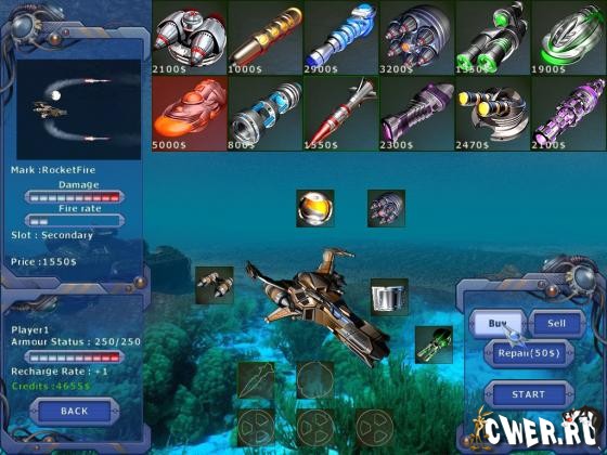 Из уничтоженных врагов выпадают различные бонусы, которые помогут в бою. Пополни арсенал своего корабля в оружейном магазине и разгроми врага!