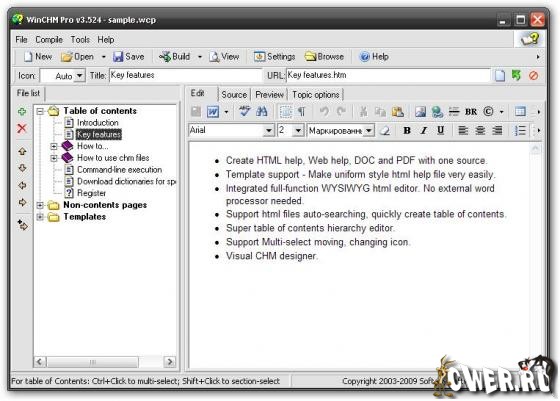 WinCHM - небольшая утилита для создания файлов помощи, книг или журналов в формате HTML и CHM (help file), Web help, PDF and Word файлов. Программа имеет визуальный редактор. Так же вы сможете не только создавать, а и конвертировать HTML файлы в CHM файлы, устанваливать иконки созданным файлам и многое другое. Есть поддержка созданных шаблонов при последующем создании документов. Страницы справок создаются в удобном редакторе, большим плюсом является то, что она не использует сторонних компиляторов, при этом имеет сравнительно небольшой размер.