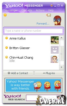 Yahoo! Messenger - мощный и весьма популярный в Европе и США IM-мессенджер (аналог ICQ). Программа обладает приятным и интересным интерфейсом, огромным функционалом (включая поддержку видеочата и голосового общения (VOIP телефонии) и не несёт в себе никакой нежелательной рекламы (в официальных клиентах ICQ её навалом). Программа обмена быстрыми сообщениями компании Yahoo!, использующая собственный протокол. Предназначена для общения в режиме реального времени с другими пользователями интернета.