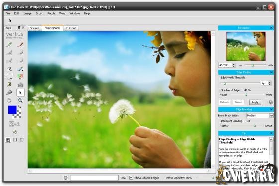 Vertus Fluid Mask представляет собой наполовину автоматизированный инструмент, позволяющий вырезать из слоя объекты по выбору пользователя. Работает довольно просто: предварительно слой анализируется, и программа выделяет на нем все четкие и нечеткие границы, которые находит на этапе анализа изображения (раньше требовалось нажимать специальную кнопку, теперь все делается автоматически при открытии изображения), работает программа, сворачивая полностью сам Photoshop и подгружая собственный интерфейс.