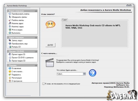 Неуклонно возрастающее число желающих использовать компьютер для работы с цифровым фото и видео говорит о том, что, возможно, уже в недалеком будущем вместо привычных фотоальбомов гостям будут предлагать посмотреть DVD с фотографиями и видео прошедших лет. Для того чтобы разобраться в тонкостях обработки фото и видео материала необходимо иметь достаточно много свободного времени и обладать железной выдержкой, которая бы позволяла сохранять спокойствие после очередной "недопустимой операции" в Adobe Premierre. Если ни первого, ни второго у вас нет, выход один - воспользоваться менее сложным программным обеспечением, с помощью которого вы сможете редактировать отснятый материал. Такая утилита должна содержать универсальный набор инструментов, для основных операций - резки и склейки видео, конвертирования в другой формат и т.д. Примером такого "мультимедийного мини-комбайна" может служить Aurora Media Workshop. Несмотря на то, что интерфейс программы достаточно прост, разработчики постарались сделать программу еще понятнее для пользователя и сделали мини мастер Getting Started. Тут предлагается выбрать из списка операцию, которую вы хотели бы произвести в программе. Кроме этого, доступно несколько десятков советов, раскрывающих возможности программы. Ознакомившись с ними, вы будете знать, как вам может пригодиться Aurora Media Workshop.