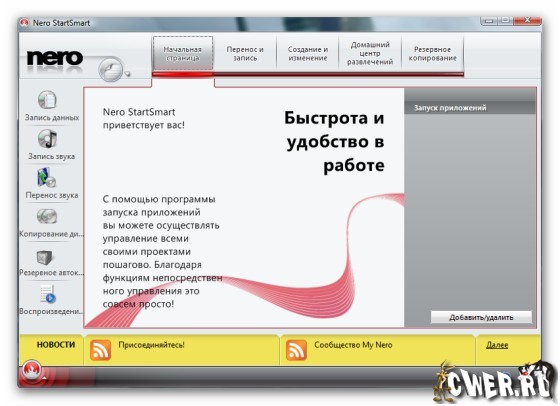 Nero Burning ROM - cамый свежий набор программного обеспечения цифрового мультимедиа и домашнего центра развлечений следующего поколения, которое пользуется наибольшим доверием в мире. Его характеризует передовая функциональность, благодаря которой наслаждаться цифровым мультимедиа так просто. Этот простой в использовании, но мощный набор мультимедиа дает вам свободу создавать, считывать, копировать, записывать, редактировать, совместно использовать и передавать данные в сети. Что бы это ни было — музыка, видео, фото или данные — наслаждайтесь ими и используйте совместно с родными и близкими когда угодно и где угодно. Ваша цифровая составляющая жизни еще никогда не была такой свободной, ощутимой и веселой, как с простым в использовании командным центром Nero StartSmart.