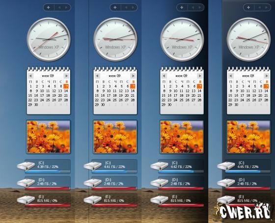 Панель Windows Sidebar имеет 4 вида: Clear (прозрачная панель), Clear with Border (прозрачная панель с рамкой), Clear Gradient (прозрачная панель с темным градиентом), Clear-Black (прозрачная темная панель). Любую панель вы можете выбрать при установке.