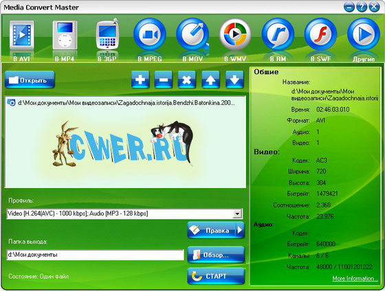 Media Convert Master - умеет конвертировать файлы из одного видеоформата в другой. Причём делает всё это с огромным числом популярных форматов: AVI, MP4, 3GP, MPEG, MOV, WMV, RM, SWF, AAC, AC3, MP2, MP3, AMR, WAV, VOB, ASF.