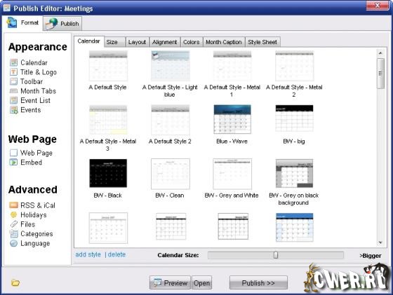 Web Calendar Pad - программа для создания профессиональных иллюстрированных HTML календарей для вашего веб сайта. Ваши посетители смогут рассматривать, скачивать, выводить на печать и даже подписывать. Возможность выбора из большого числа календарных стилей, а также есть возможность создания собственного стиля используя свои фотографии, цвета, текстуры, шрифты и прочее.