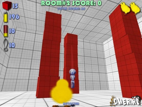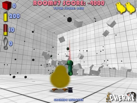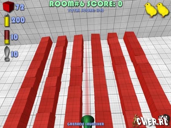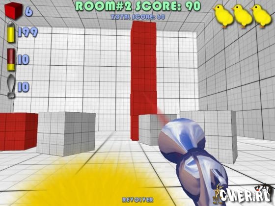 Правила игры: выстрел из револьвера -100 очков, выстрел из ружья или гранатомёта -500 очков, сбитый кубик +10 очков, сбитый рикошетом кубик +10 очков, умноженные на 10 за каждый рикошет. Дотронулись до красного кубика - минус куча очков. Цель - закончить уровень в плюсе.