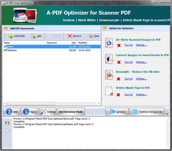 A-PDF Scan Optimizer - предоставляет быстрый способ для пакетной оптимизации отсканированных документов PDF. Программа поможет вам исправить "косые" отсканированные изображения, преобразовывать отсканированные изображения в черно-белый или серый цвет, а также отдекорировать изображения и удалять неиспользуемые пустые страницы. A-PDF Scan Optimizer открывает файл PDF и автоматически проверяет наличие смещенных изображений, а затем корректирует перекос с помощью специального алгоритма.